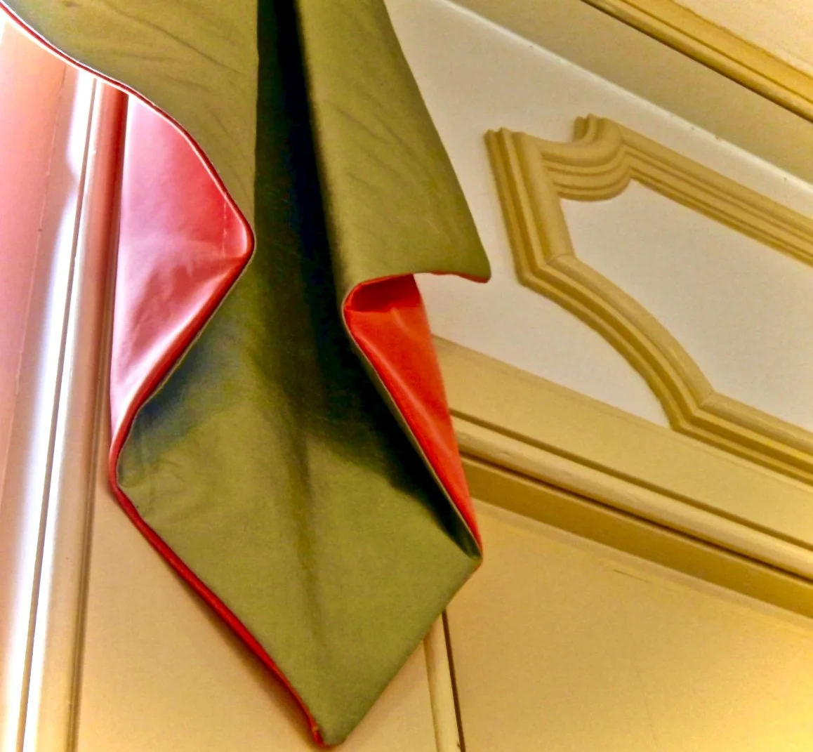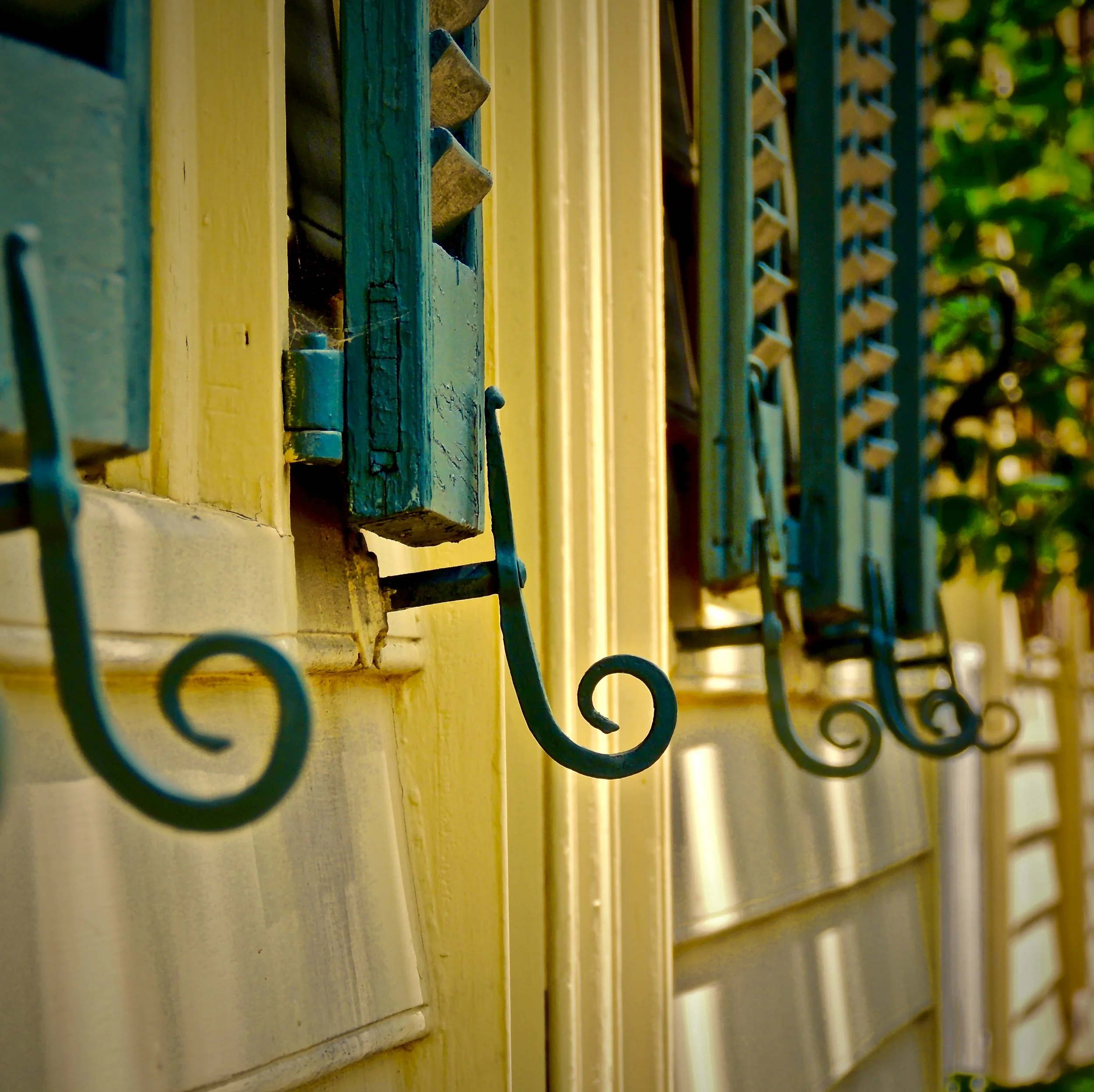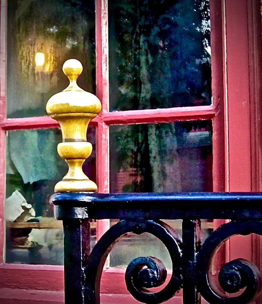 Close-up of a decorative wooden post on a dark metal railing with a window and red frame in the background.