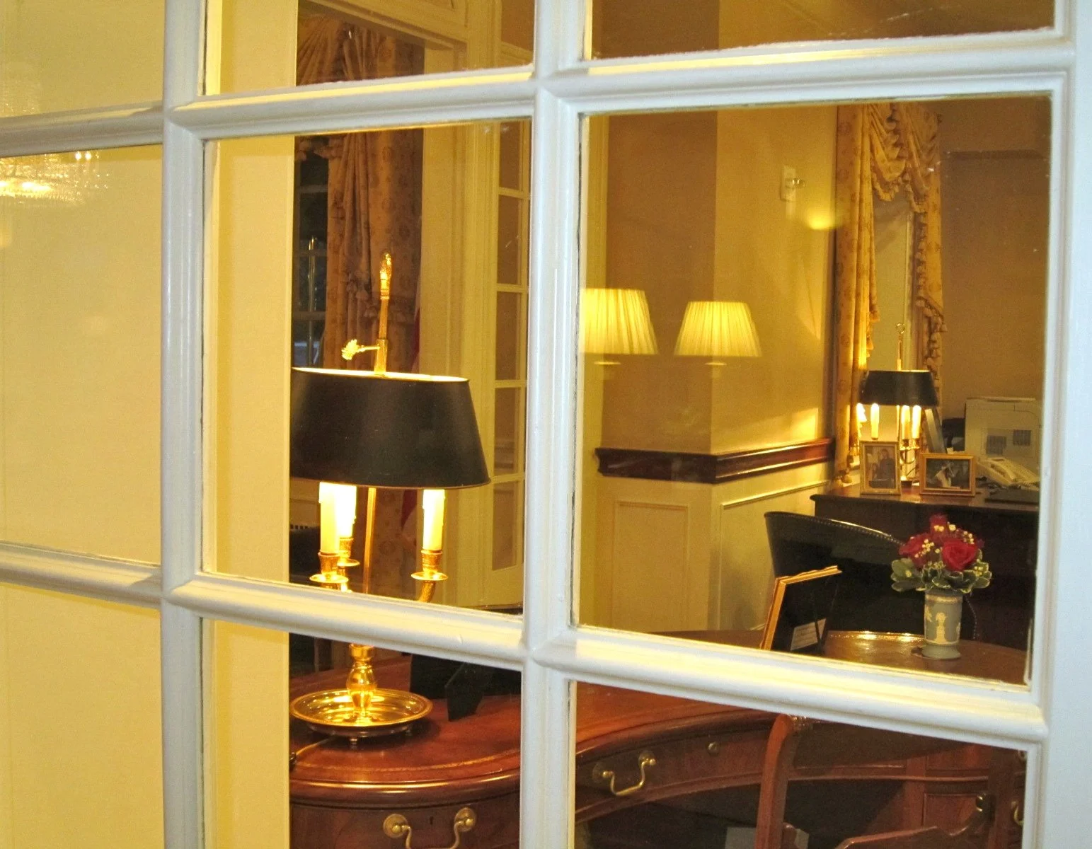 Polished brass doorknob and lock plate on wooden door