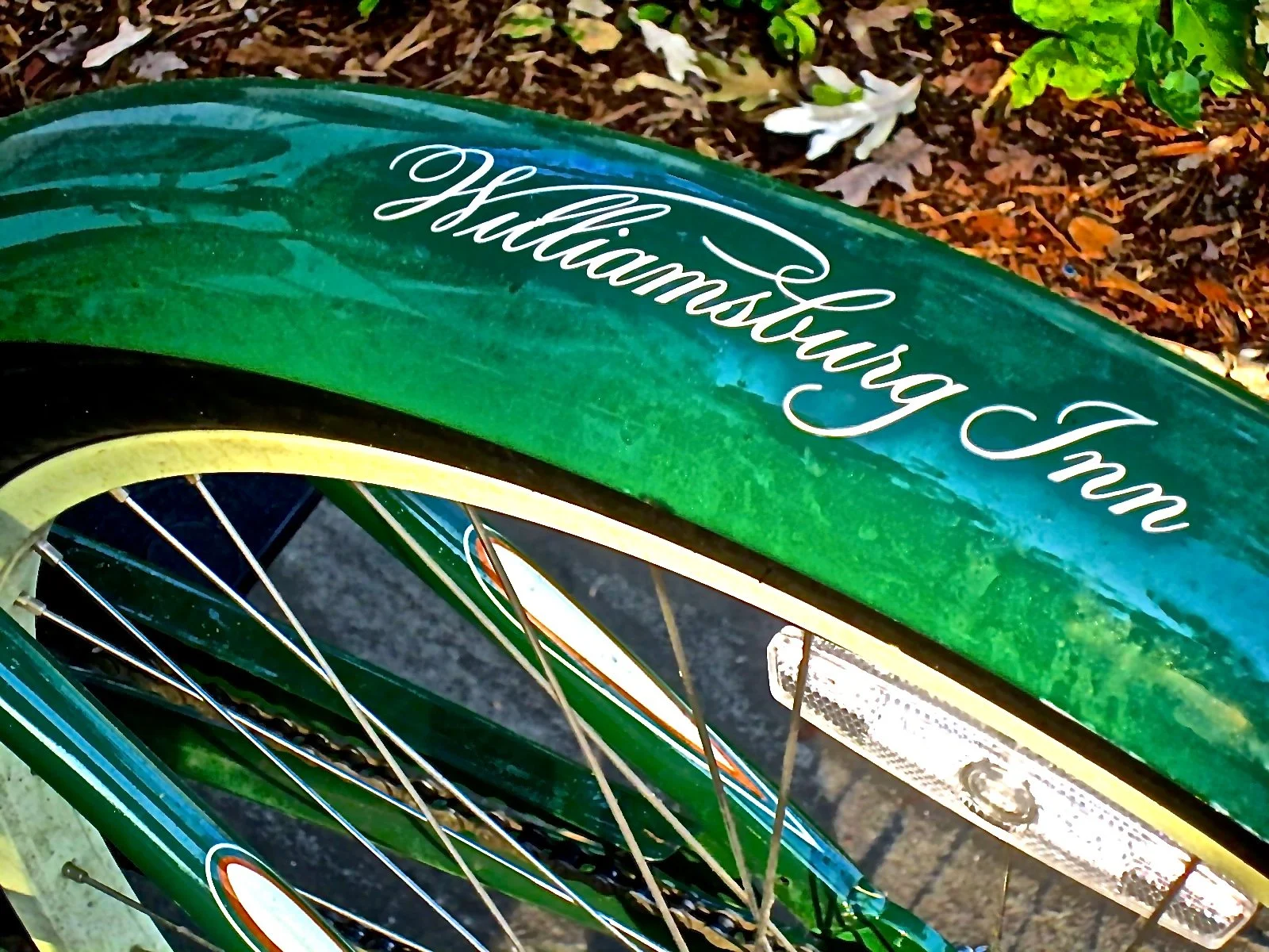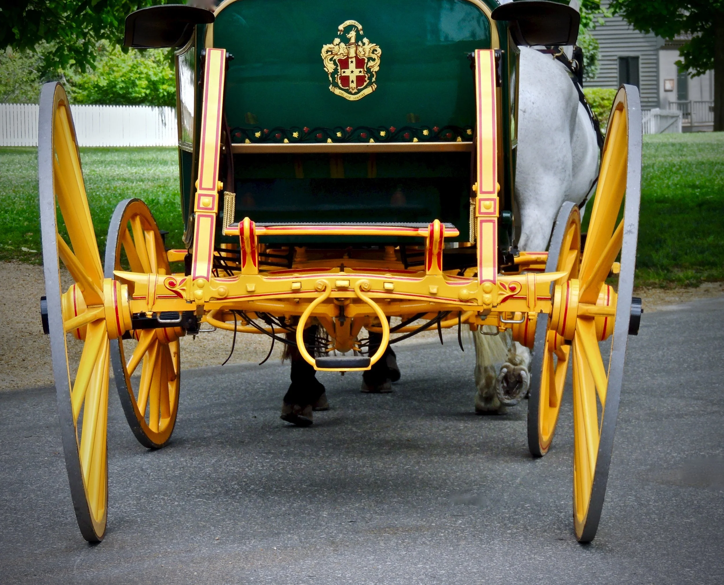 Rear view of a vintage horse-drawn carriage with decorative yellow wheels and a green body.