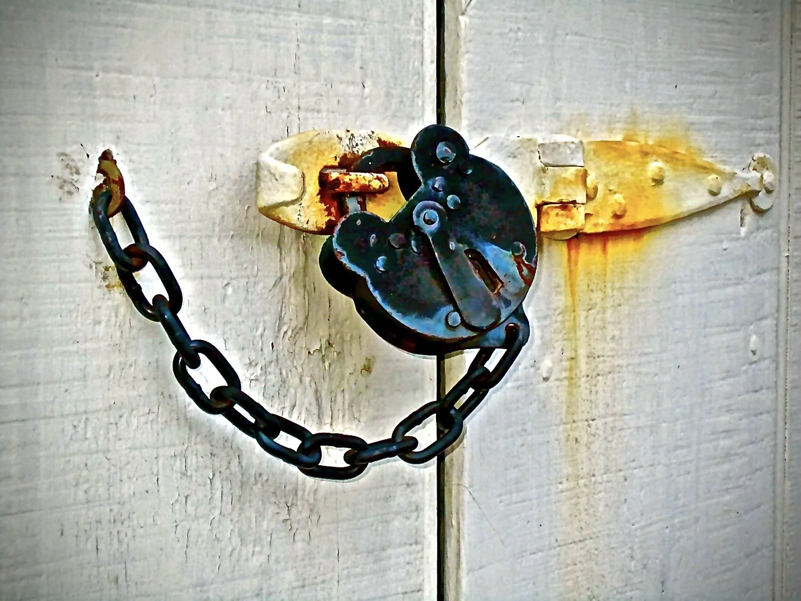 Rusty lock and chain on weathered wooden door, with peeling paint and corrosion evident.