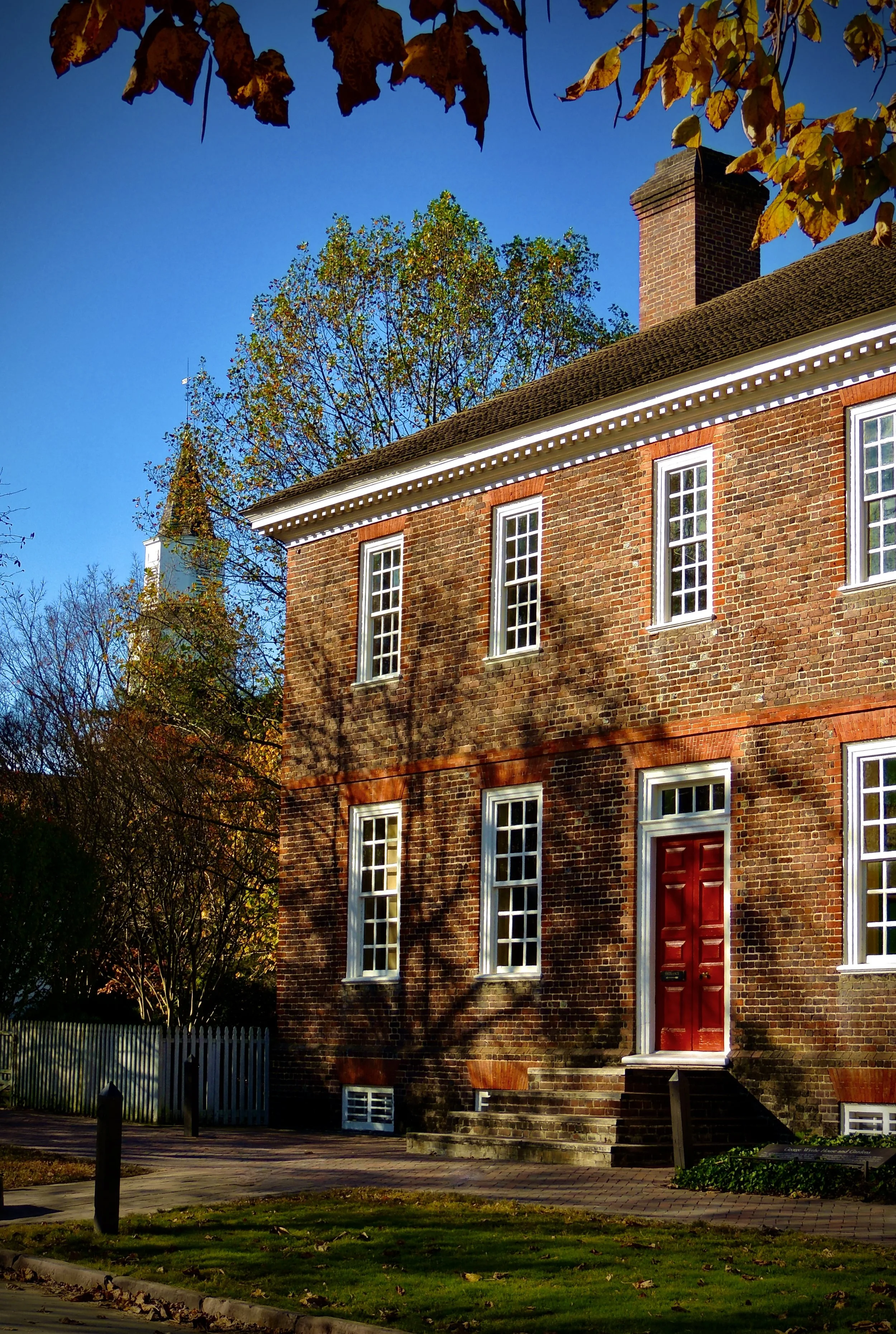 Historic colonial-style house with brick chimneys and wooden fences
